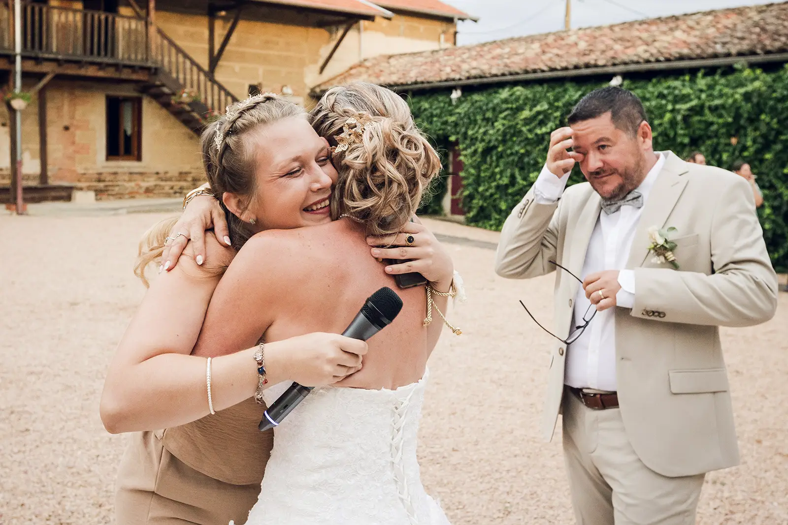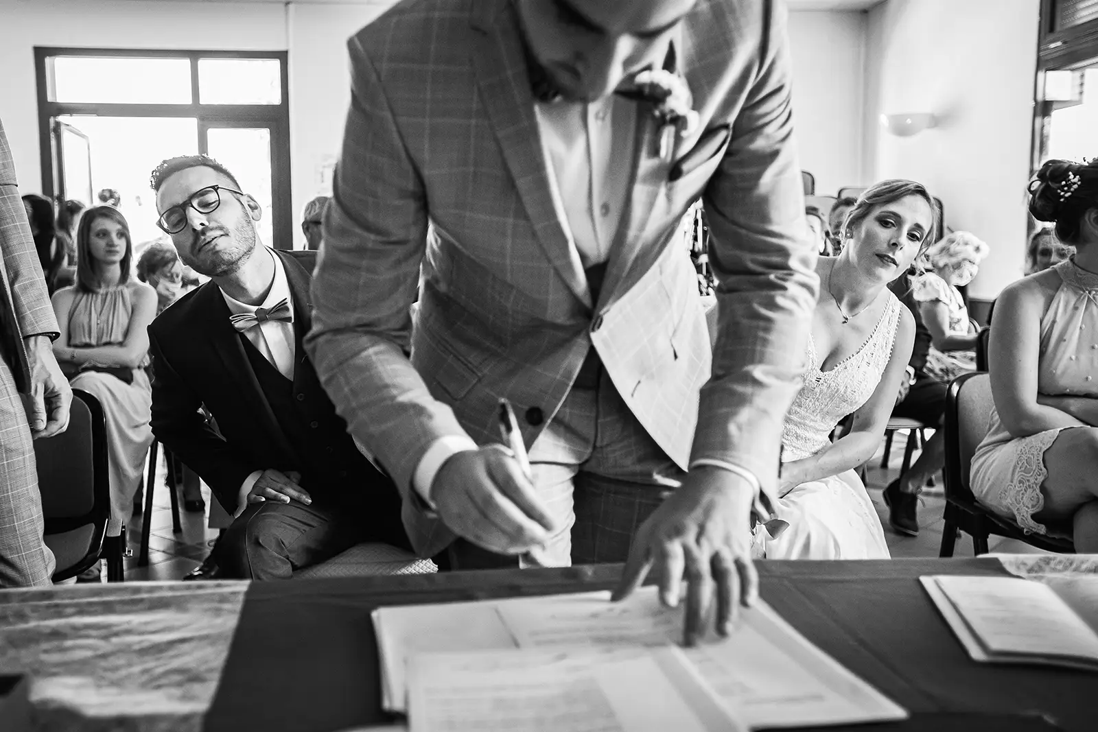 Bravo pour la qualité, la technique et la justesse de ton travail. Bravo d'avoir réussi à nous transmettre autant d'émotions par de simples images. Merci d'avoir bien voulu être notre photographe, de nous avoir suivis depuis le début et même rassurés à la toute fin. La dernière visio dans la voiture nous a sacrément soulagé. Merci pour ta gentillesse et ta bienveillance. Merci pour ta discrétion durant cette journée, ce qui n'était pas chose simple au milieu de 26 personnes. Tu as un immense talent et un style bien à toi. On te souhaite de t'épanouir toujours plus dans ton travail, pour rendre heureux toujours plus de couples et familles !Discrétion et talent de photographe