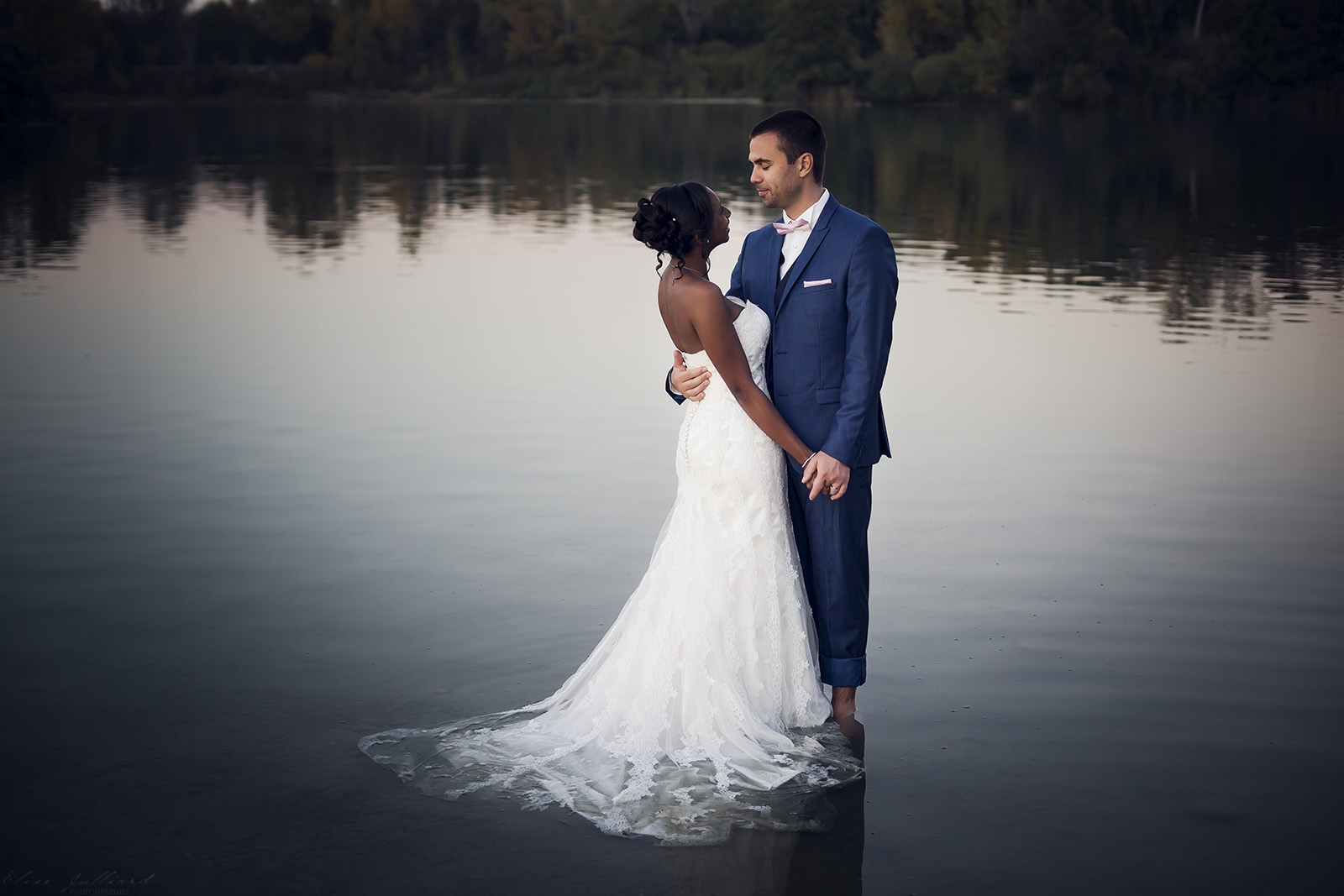Après leur mariage, Wafa et Eric m’ont recontacté pour une nouvelle séance photo automnale. L’occasion pour eux, de remettre leur costume de mariage pour une séance trash the dress. Je leur ai proposé de finir la séance en partie dans l’eau, idée qui leur a bien plu. Nous sommes donc allés au parc de Miribel Jonage à côté de Lyon pour le coucher de soleil. Wafa était presque tentée de finir complètement à l’eau, mais une fois le soleil passé derrière l’horizon, il faisait nettement plus frais.